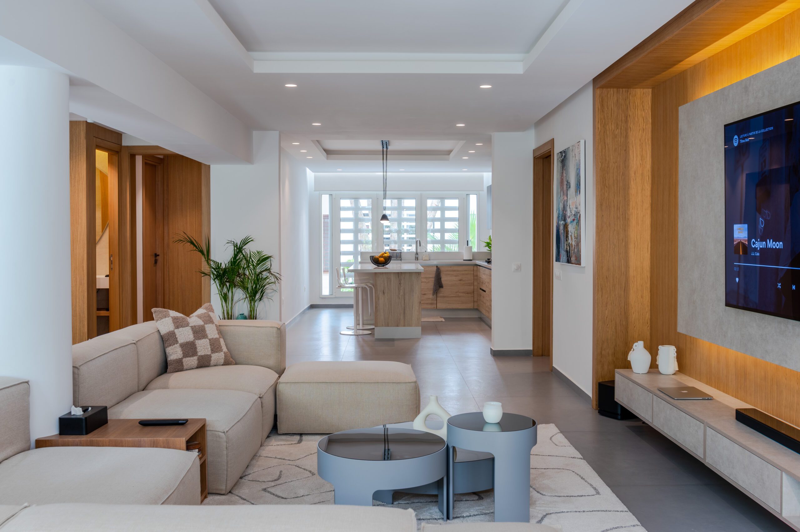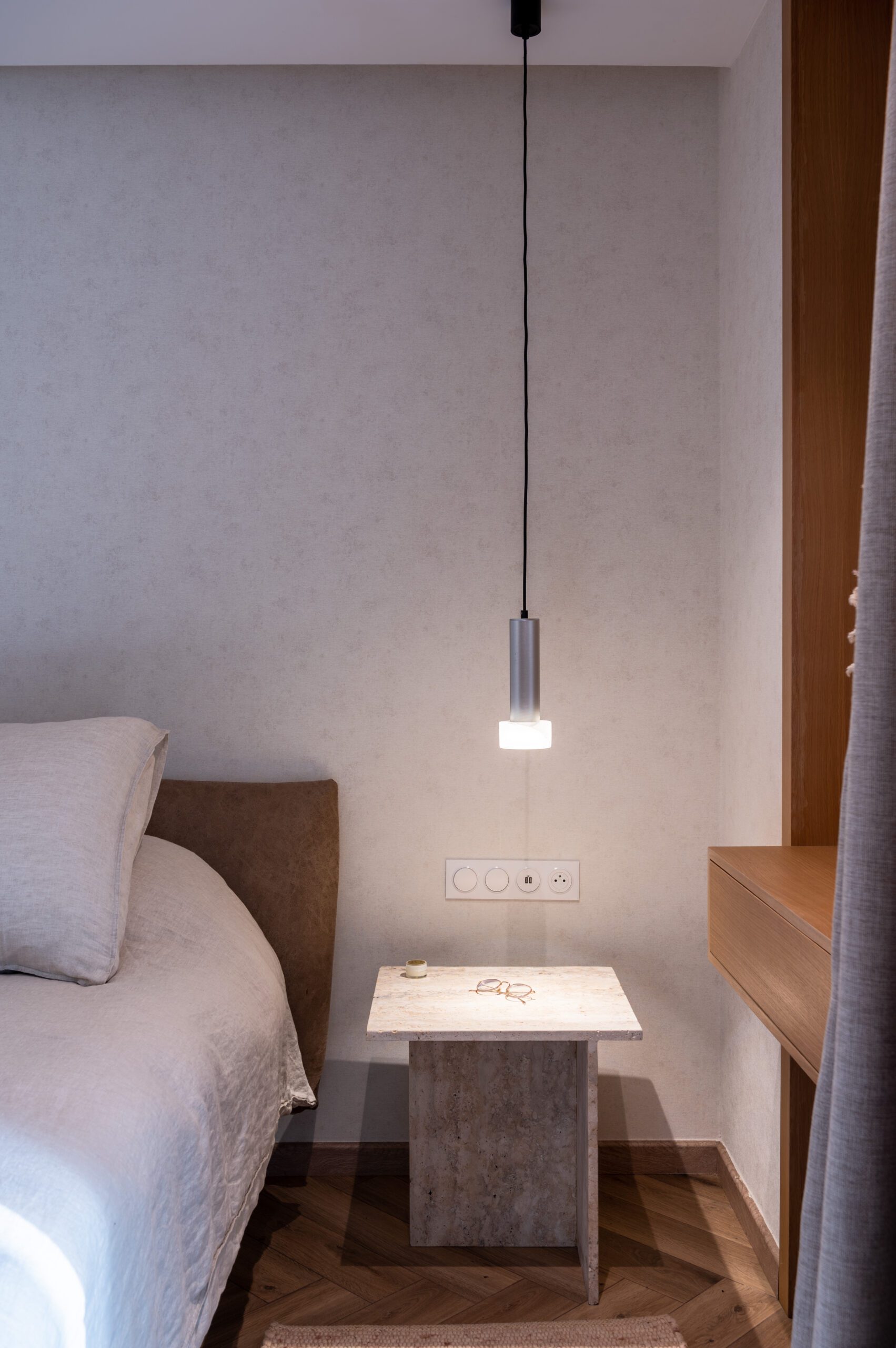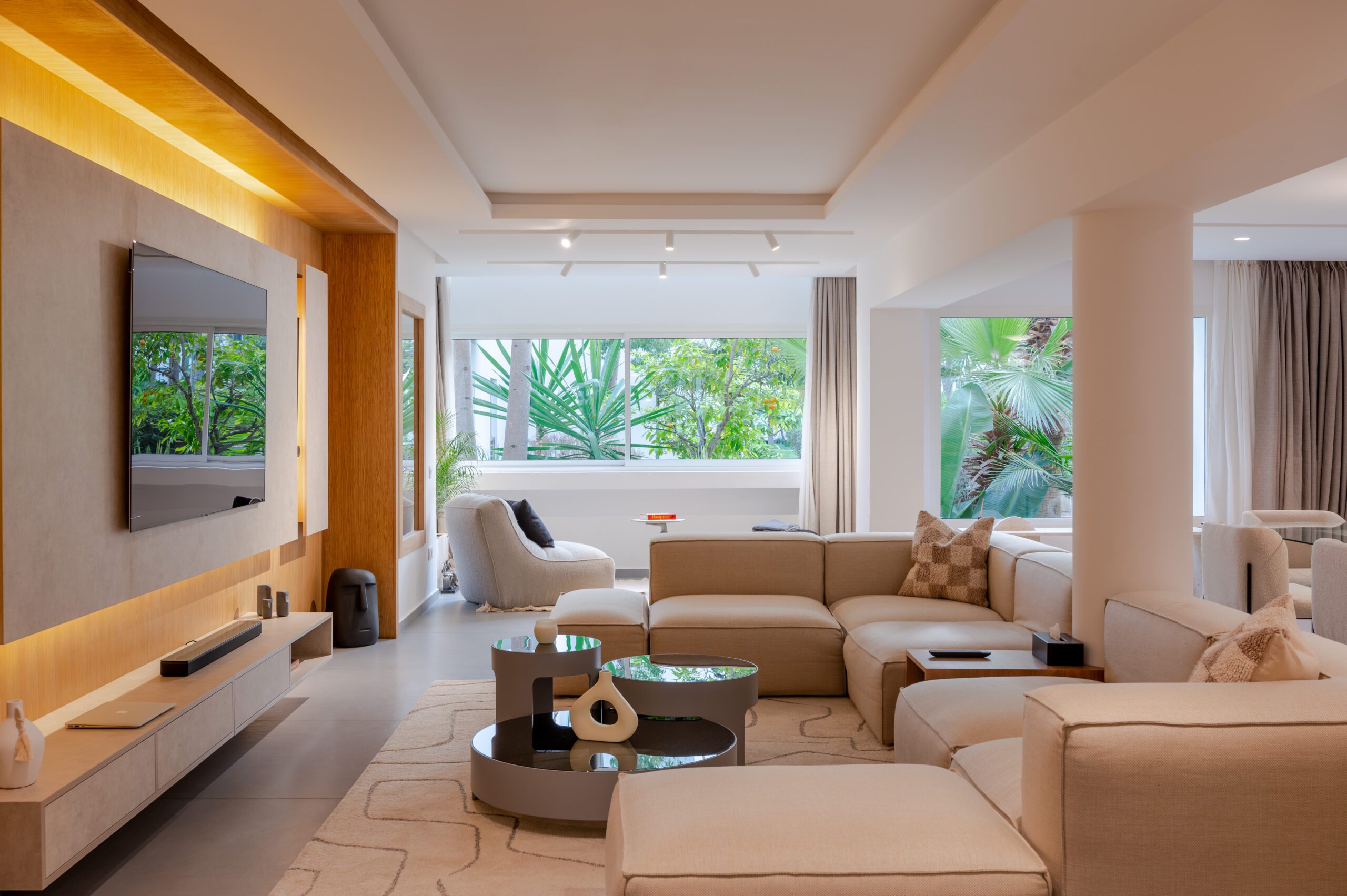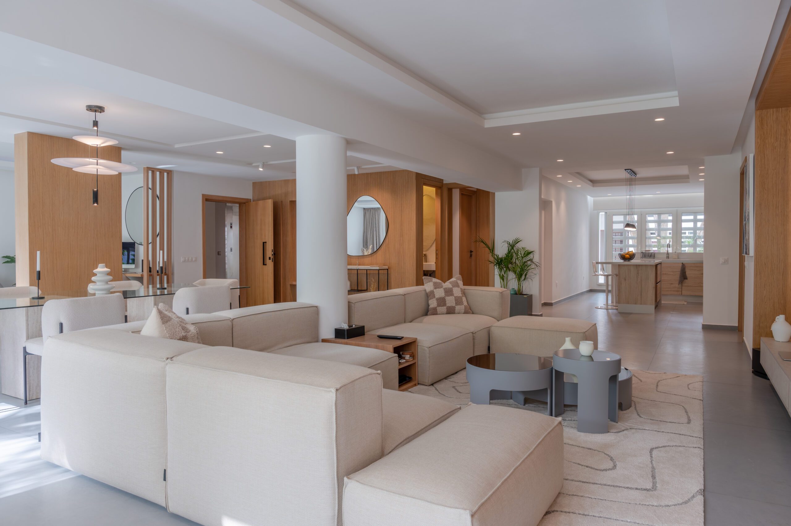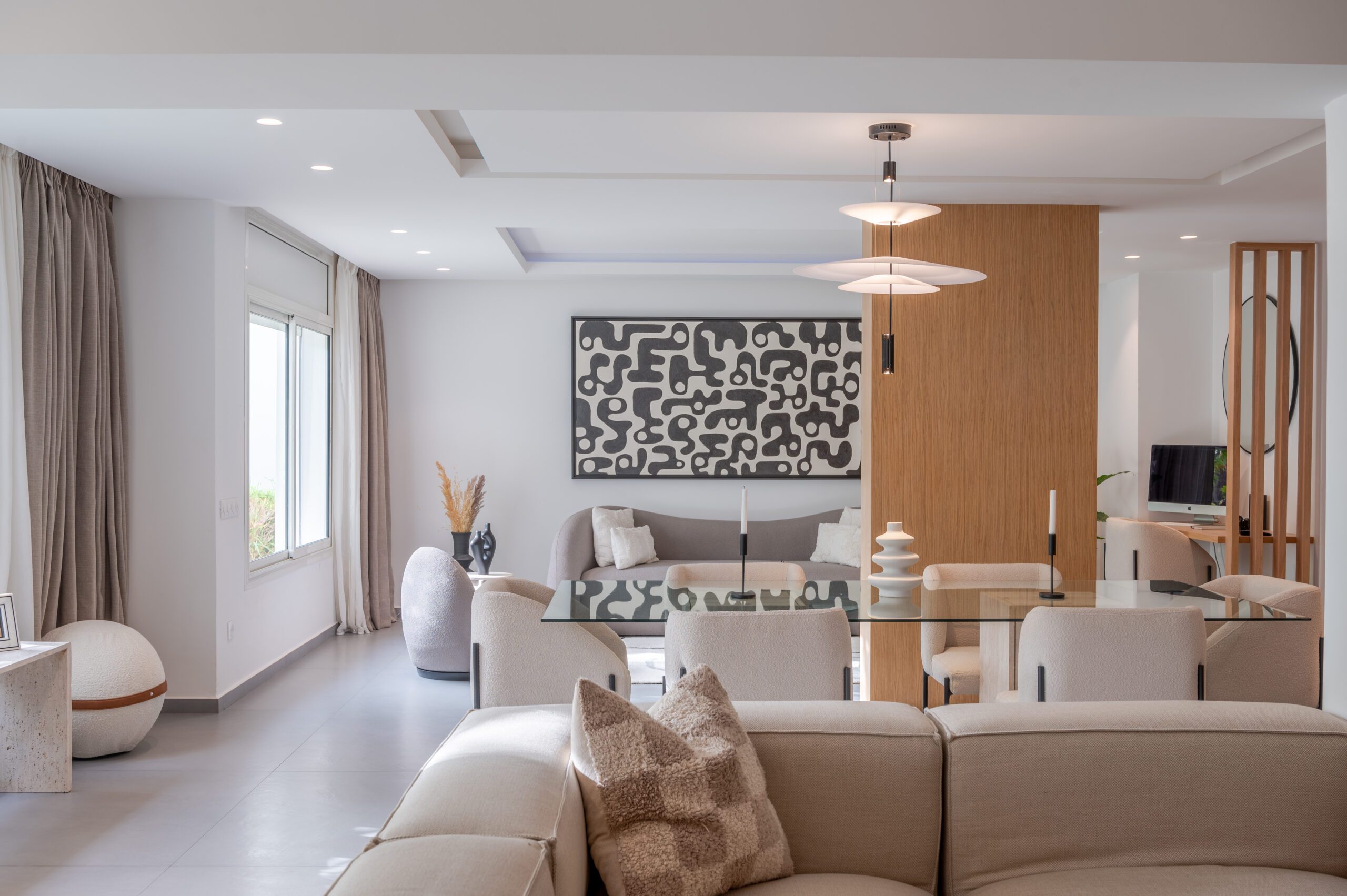 In the heart of Rabat’s once dark and confined Agdal district, this apartment has been transformed into a bright and minimalist haven, evoking a refined elegance that celebrates conviviality. Every modification, every addition has been designed to create an open and welcoming living space, where natural light abounds and nature invites itself in harmony. The project to completely redesign this apartment aimed to free up space, promote the circulation of light and maximize sunshine. Partition walls were knocked down, new windows were opened, and the result is a living space bathed in daylight. In keeping with the minimalist and understated aesthetic, the design choices were guided by clean lines, natural materials and light shades. Every detail, from the furniture to the decorative elements, has been carefully selected to create a calming and harmonious atmosphere. The new openings overlooking the surrounding gardens not only bring additional light but also a real breath of fresh air, creating a green tableau at the very heart of the apartment. The union between urban minimalism and nature brings an unexpected softness to the whole, transforming this space into a true urban refuge. This apartment embodies the perfect combination of functionality, aesthetics and harmony with the environment. Every element, from the layout of the rooms to the design choices, demonstrates the commitment to creating a living space that is both modern and warm, where every moment is an invitation to relaxation and serenity.